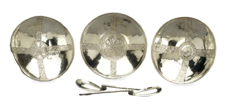 Most interesting of all, however, are the 8 silver bowls with cruciform patterns and the pair of silver spoons, one inscribed with Paulos, the other Saulos (hope you can all remember your Sunday school lessons…). These look for all the world like baptismal gifts and their presence in a pagan burial setting could well indicate an adult convert who had not let go of the old ways (or whose people hedged their bets on his behalf when it came to his burial). It wasn’t worth the risk of upsetting the old or new gods, so both were included.